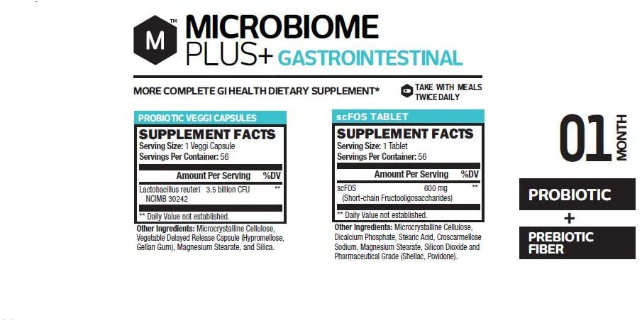 Microbiome Plus+ Gastrointestinal Combo pairs the clinically studied probiotic strain Lactobacillus Reuteri NCIMB 30242 with prebiotic short-chain fructooligosaccharides (scFOS) fiber in a convenient daily system.